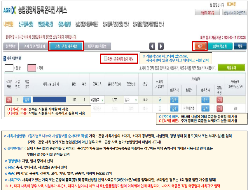 - 가축 및 곤충 사육시설 정보도 필요한 경우 입력하며, 각 단계별로 저장 후 다음 단계로 넘어갑니다.