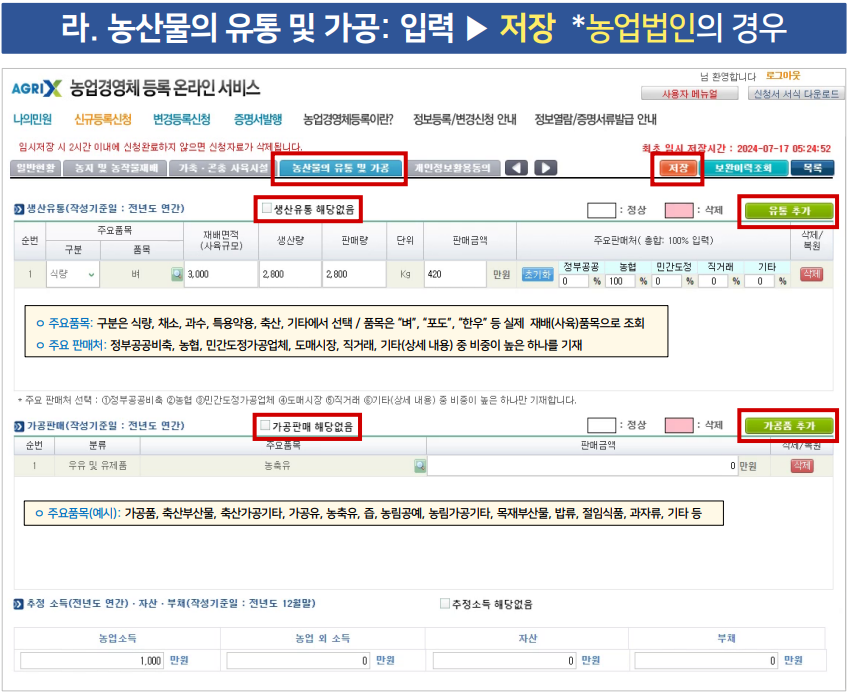 - 농업인의 기본 정보를 입력하고 저장합니다. 여기에는 농지 정보, 재배 작물 정보 등이 포함됩니다.