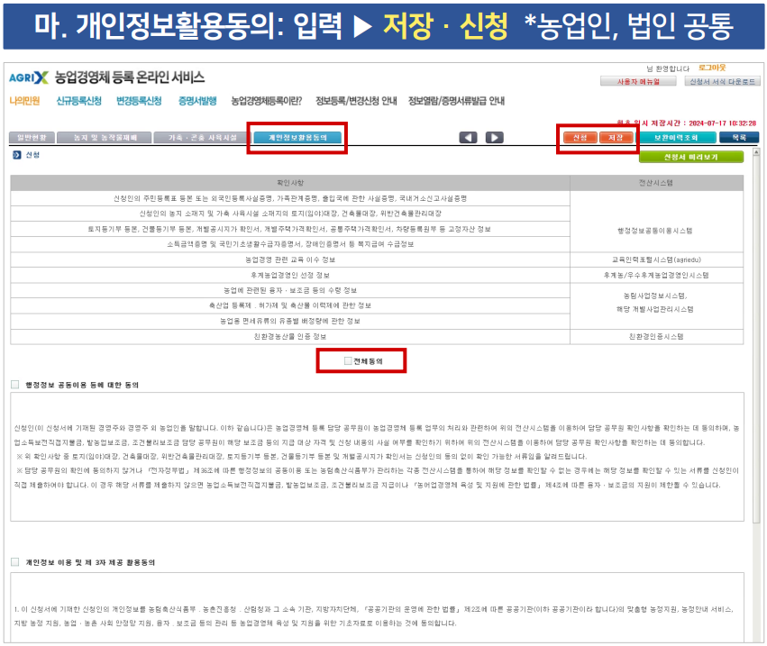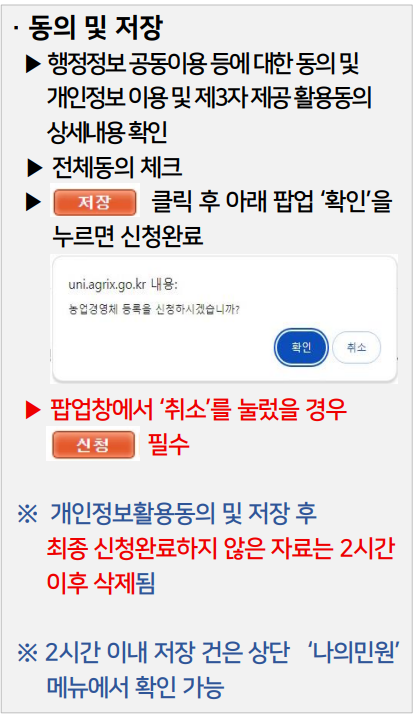 모든 정보를 입력하고 나면 개인정보 활용에 대한 동의를 해야 합니다. 행정정보 공동이용과 제3자 제공에 대한 동의 사항을 확인하고 '전체동의'를 체크한 후 신청을 클릭하면 등록 신청이 완료됩니다. 만약 신청을 완료하지 않고 저장만 한 경우, 해당 정보는 2시간 이내에 자동으로 삭제될 수 있으므로 주의가 필요합니다.