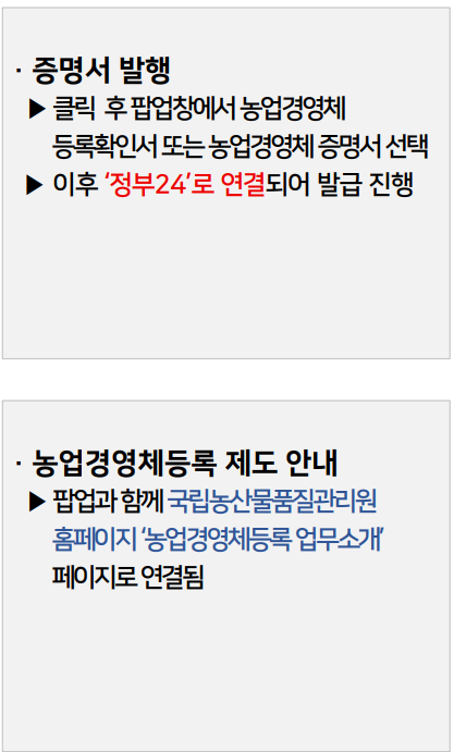- 신청이 완료되면 '정부24'를 통해 농업경영체등록 확인서를 발급받습니다.